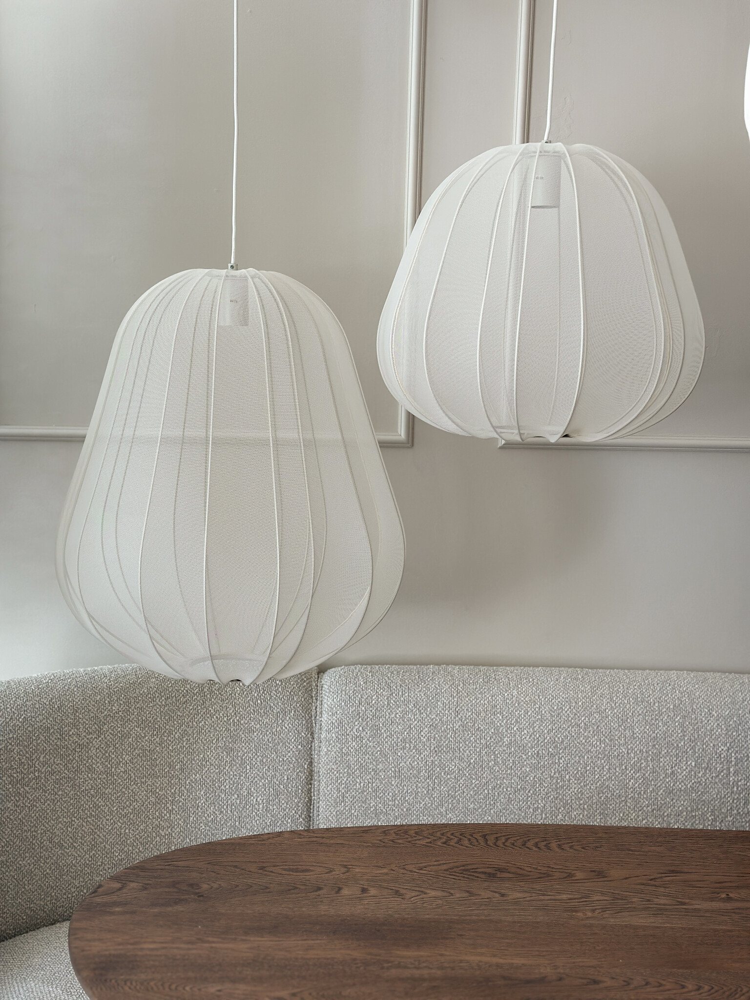De elegante en transparante stof waarvan de Balloon lamp is gemaakt, geeft hem een lichte, speelse look. Op de lamp zie je sierlijke, handgemaakte details. Details die een bijzondere techniek en een vaste hand vergen. Deze prachtige lamp past perfect in de Scandinavische / Japandi woonstijl. In een groepje met verschillende maten, of juist wat strakker alleen of met een soortgelijke maat. Daarbij brandt de lamp echt heel sfeervol!