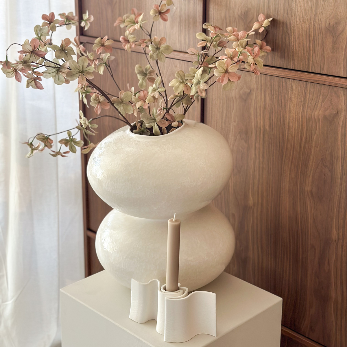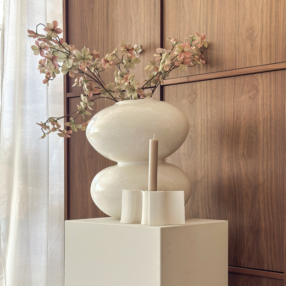 Lofthus look NO.23 is een statement set door de grote organische vaas die gevuld is met zachtroze/groene kunsttakken. De kandelaar met dinerkaars maakt deze set helemaal af.