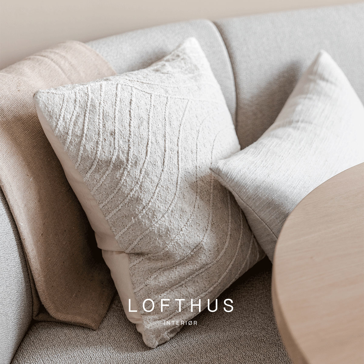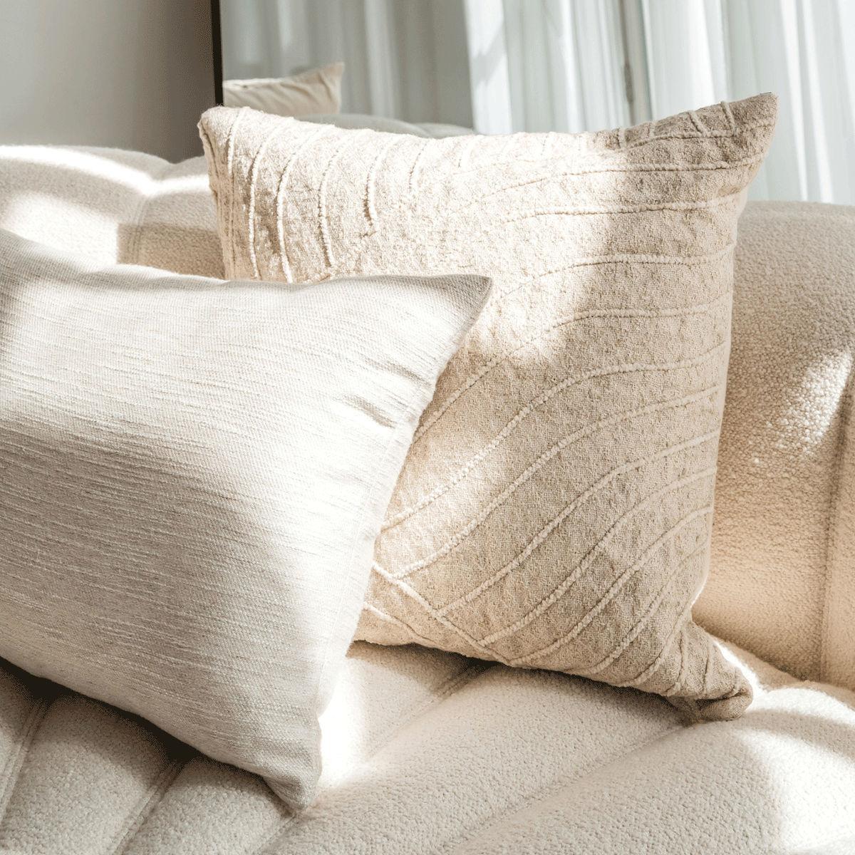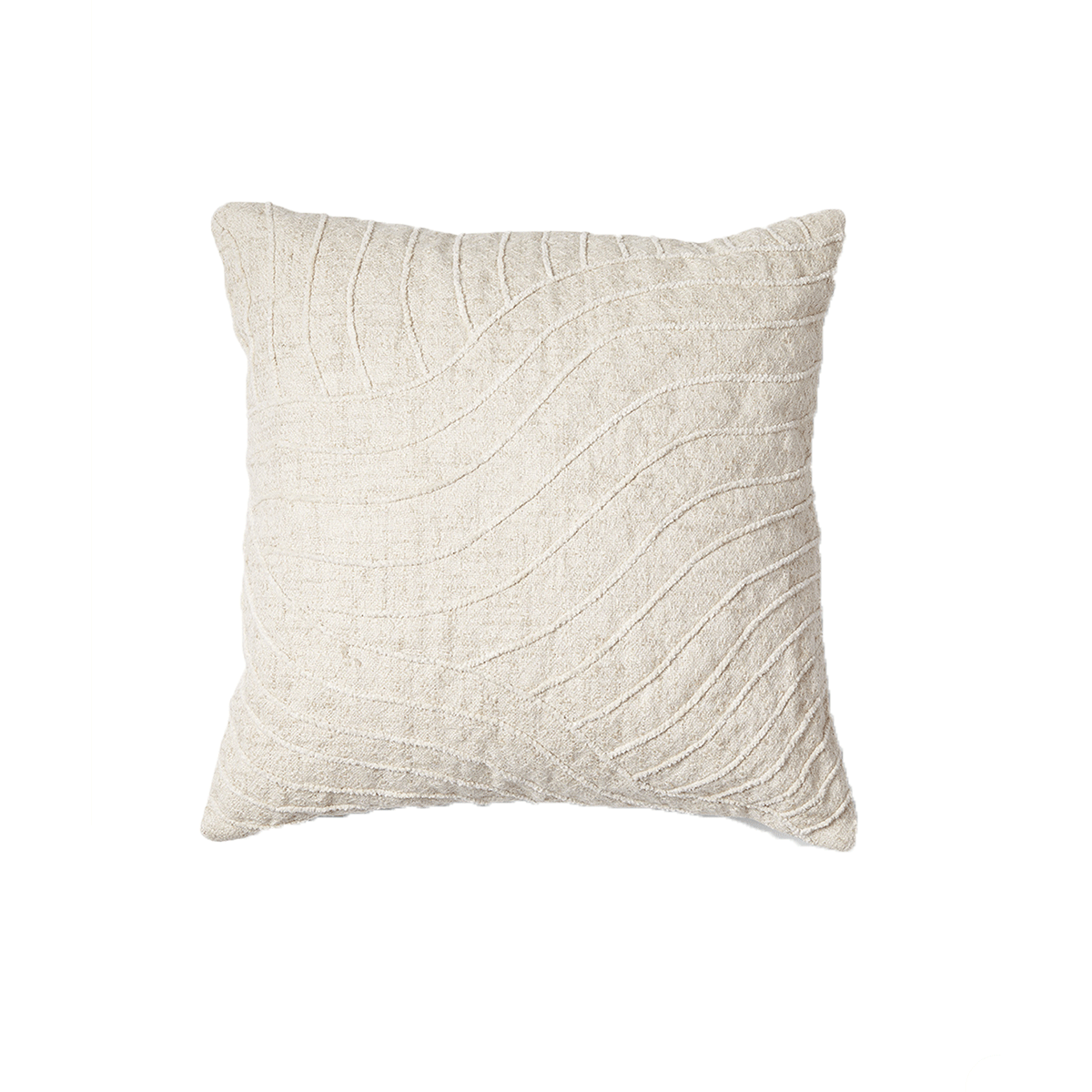 Het naturel kleurige sierkussen Lynn is gemaakt van katoen en linnen met op de voorzijde een getuft glooiend lijnpatroon. De katoenen achterzijde is uni naturel van kleur.