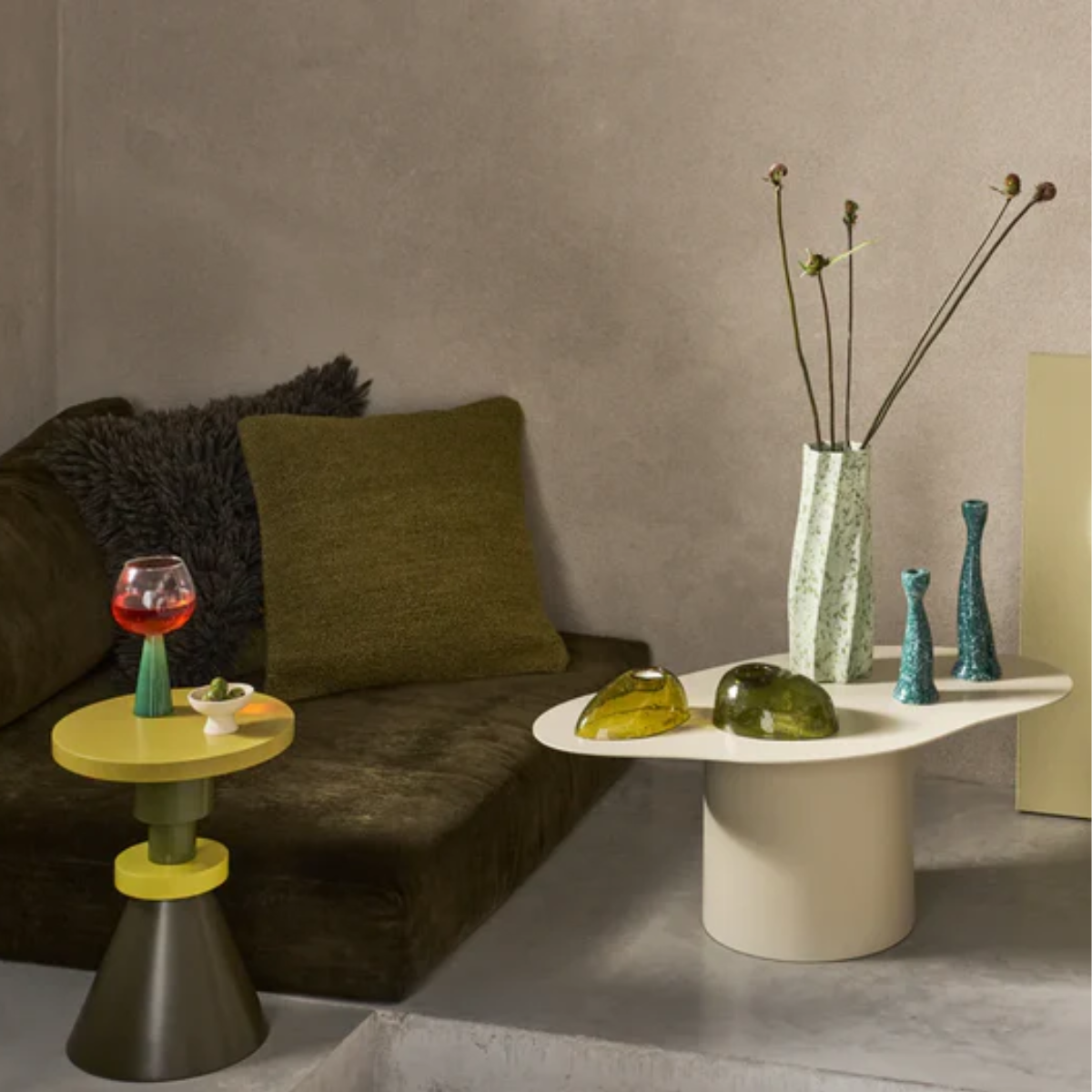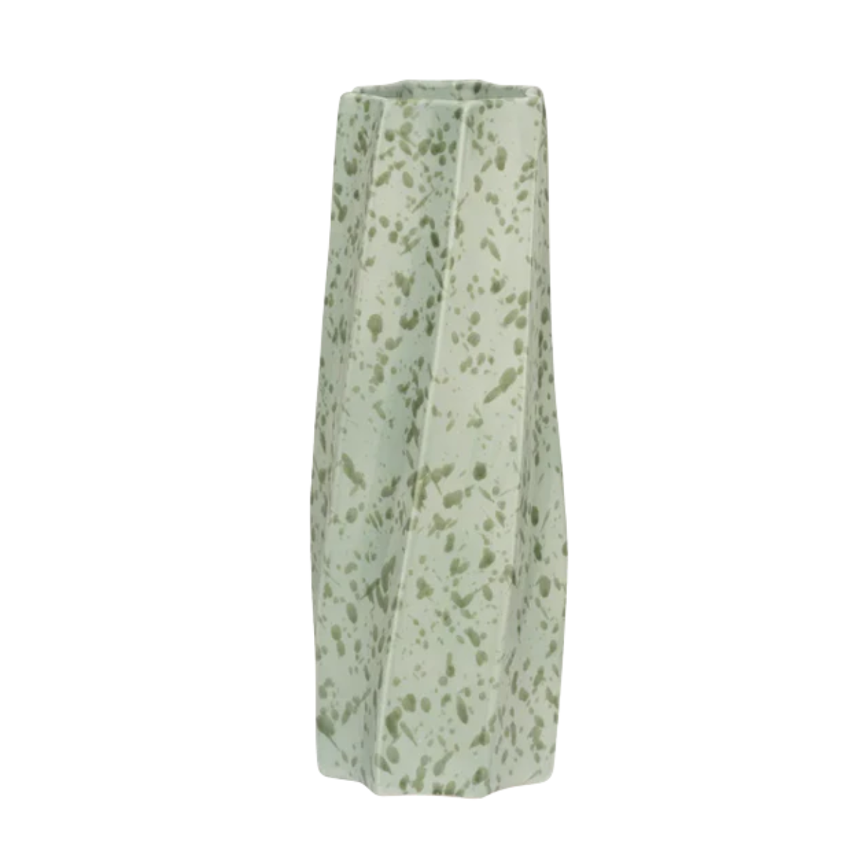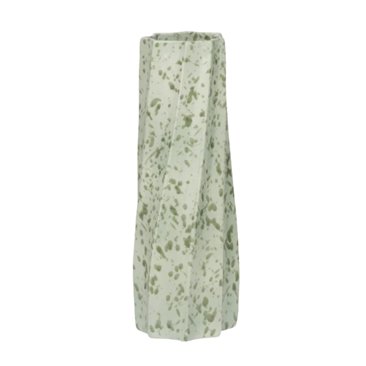 Deze hoge, smalle vaas is echt een uniek object. De opvallende twist en groen gespikkelde kleur maken het tot een statement piece in je interieur!